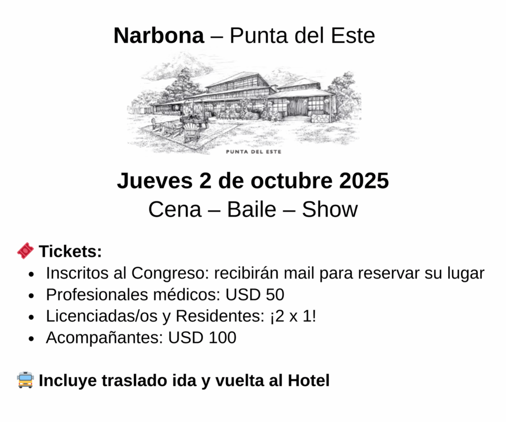 Quienes ya se encuentran registrados al congreso pueden solicitar su ticket para la Cena de Clausura (y el de su acompañante, en caso de corresponder) abonando el costo que corresponda según su categoría de inscripción.